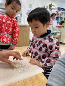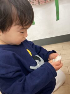 今回は中に具を入れるタイプではなく、3種類の味のふりかけがそれぞれかかったご飯から子ども達が選び、それらをラップに載せるところまでは保育者が行い、あとは自由に握ったり、丸めたり、長くしたりしてもらいました。