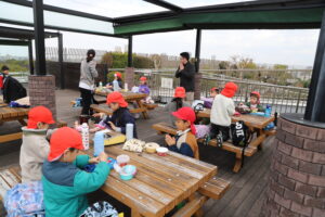 待ちに待ったお昼ご飯では、お弁当を見せ合いながら嬉しそうに食べていました。