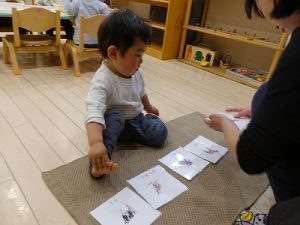 にじクラス(2,3歳児)は教具の種類も増えて新しいお仕事に目を輝かせて取り組んでいます。パズルの種類も増えて、色々なパズルに興味を示す子も多いです。