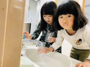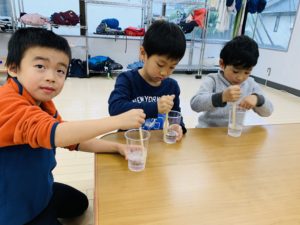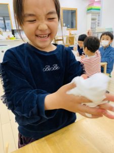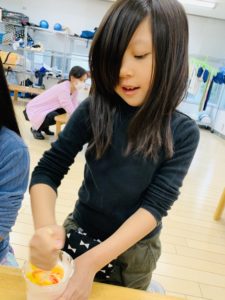 食紅を入れたり、実際に手に取って触ってみたりして楽しんでいました(*^-^*)