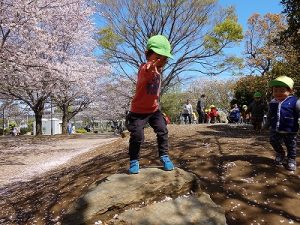 公園内を走り回って遊んだり、小高い丘に駆け上って大きな石に登ってみたりと、遊具はありませんが、その場にある自然物を使って思い切り楽しんでいましたよ。(^^♪