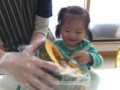 ハロウィンの前の日には、0歳児クラスと1歳児クラスで、かぼちゃを使ったクッキング!