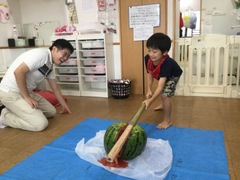 すっかりと更新が遅くなってしまいましたが、先週26日(金)にみんなですいか割りを楽しみました!