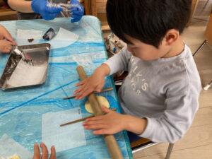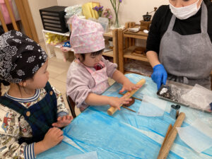 綿棒で生地を伸ばすやり方を教わります。