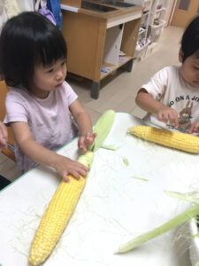 本日、つき組さんは「とうもろこしの皮むき」🌽を楽しみました。
