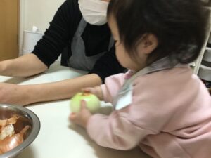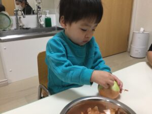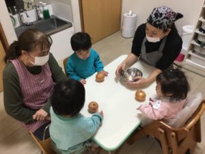 0歳児は、幼児さんたちのようにクッキングなどはできませんが、食べ物について学ぶ(触れてみる)ということで簡単なことに取り組んでいます。今回の様子をご覧ください。