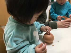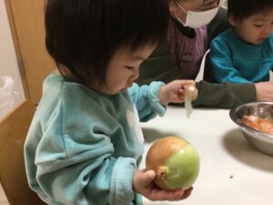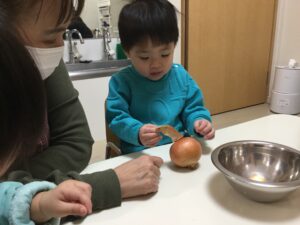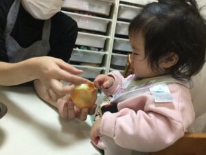 0歳児クラスでは、15日(木)に食育活動として「玉ねぎの皮むき」を楽しみました。