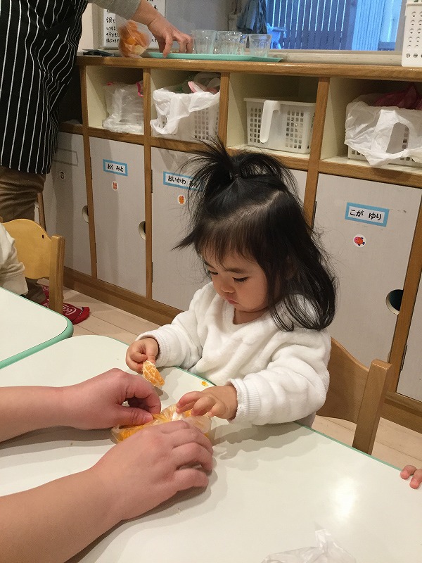 みかんの皮を剥くとプーンの甘い香りが漂います。美味しそうなみかんを目の前に思わずパクっと食べてしまう子もいましたよ。