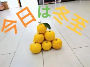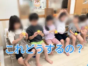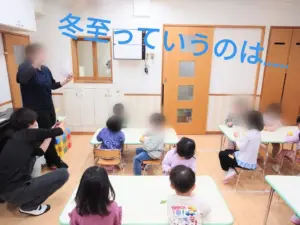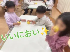 冬至はどういったものかを保育者が説明し、香りが出やすいように少し爪楊枝でチクチク🍊