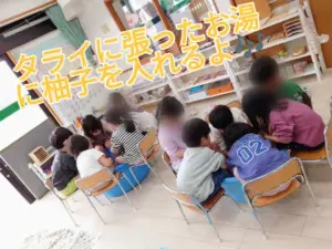今週22日(月)は「冬至」ということで保育者が持ってきた柚子を使って柚子の足湯をしました♨️