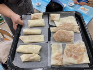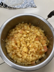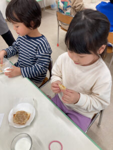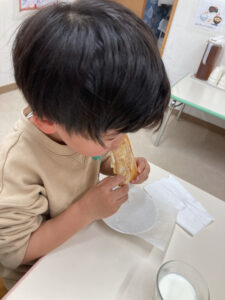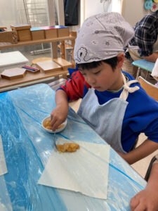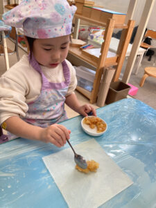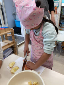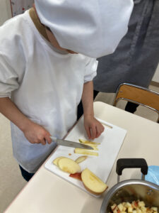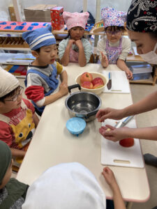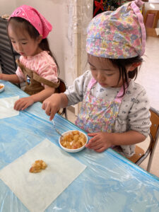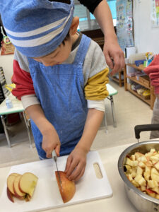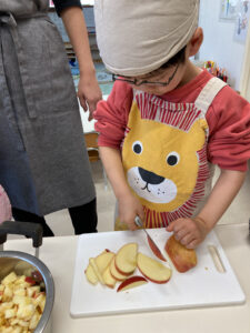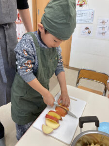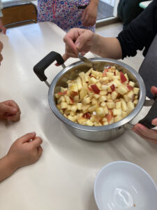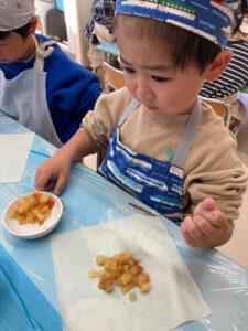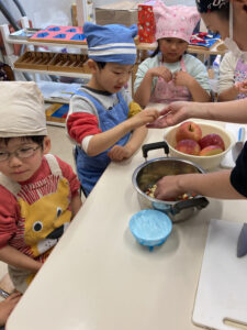 本日午後おやつは、幼児クラスは「アップルパイ」でしたが、年長組さんがりんごを切ってくれ、煮あがったリンゴは幼児クラスの皆で包んでアップルパイを作りました。