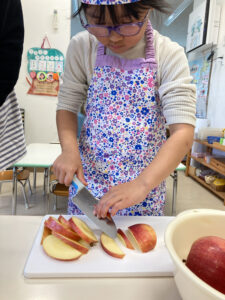 年長のたいよう組さんはりんごを包丁で切ってくれます。