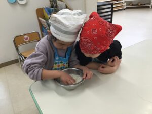 本日、幼児クラスで、米を洗って炊くと言うクッキングを行ないました。
