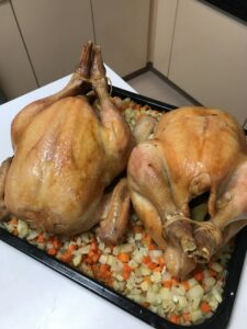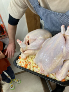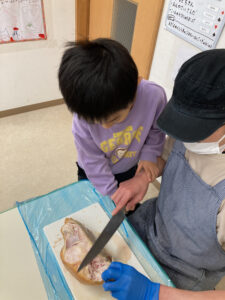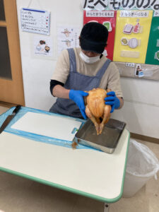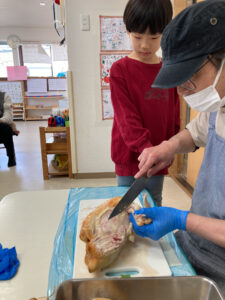 鳥の丸焼きを作り子ども達の目の前で切って見せました。