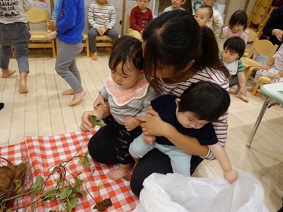 つる付きのさつまいもをみんなで触ってみたよ!小さな赤ちゃんいもや大きなお父さんいもなど、スーパーで見かける綺麗なさつまいもと比べているお子さんもいました。(^^♪