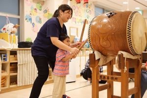 今日は夕方に音楽に合わせてみんなで太鼓を叩いてみました。大きな音にびっくりするかと思いましたが、みんなとっても楽しそうにバチを握って先生と一緒に楽しんでいましたよ。