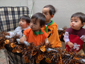 子ども達は仮装をし、近くの系列園へお菓子をもらいに出発!