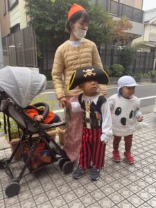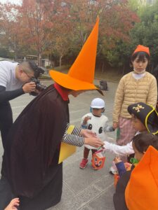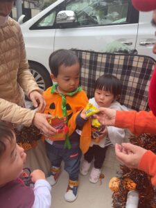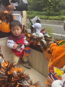 緊張しながらも保育者と一緒に「トリックオアトリート!」と各地で言っては、たくさんお菓子をもらうことができました。
