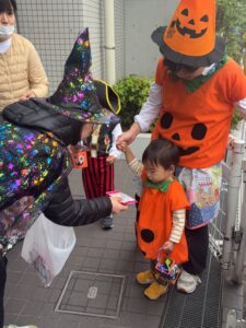 緊張しながらも保育者と一緒に「トリックオアトリート!」と各地で言っては、たくさんお菓子をもらうことができました。