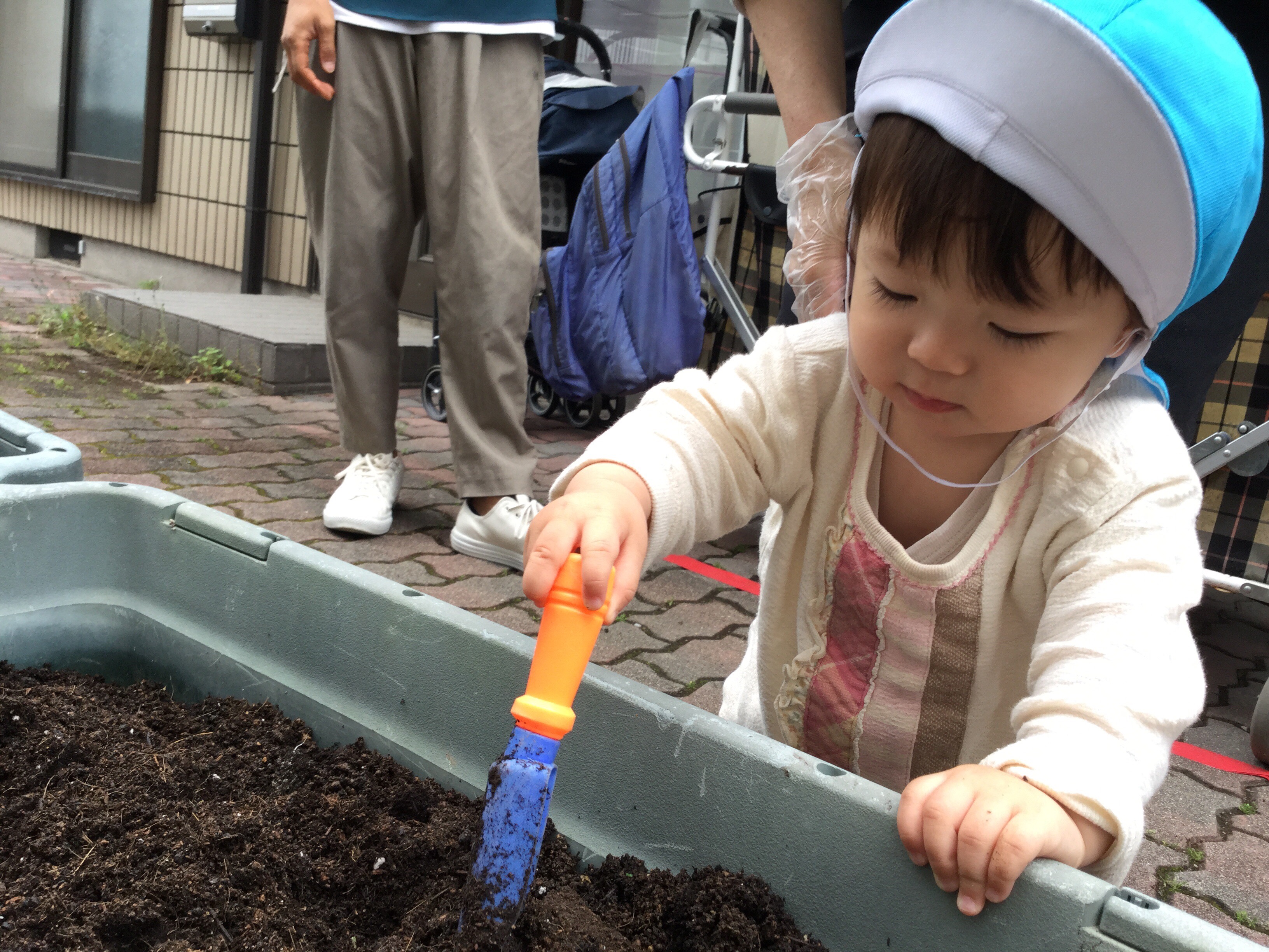 園の玄関には、チューリップを植えていたプランターがあるのですが、今度はヒマワリの種を梅雨時期に突入する前に蒔きたいと思い、5月の最終日に、みんなで種蒔きを体験しました。