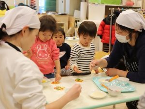 そらクラスのお友だちは自分の手にとって振りかけてみたり、スプーンで食材をのせてみました。同じ具材でまとめてみたり、混ぜてみたりと、こんなところにも個性が見られました。(^^♪