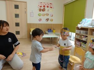 2歳児クラスでは2名のお友だちが3歳の誕生日を迎えました。王冠と写真つきの誕生日カードを貰って笑顔でいっぱいの様子でしたよ。