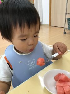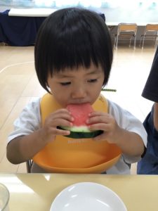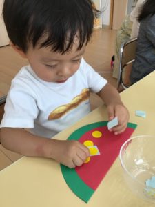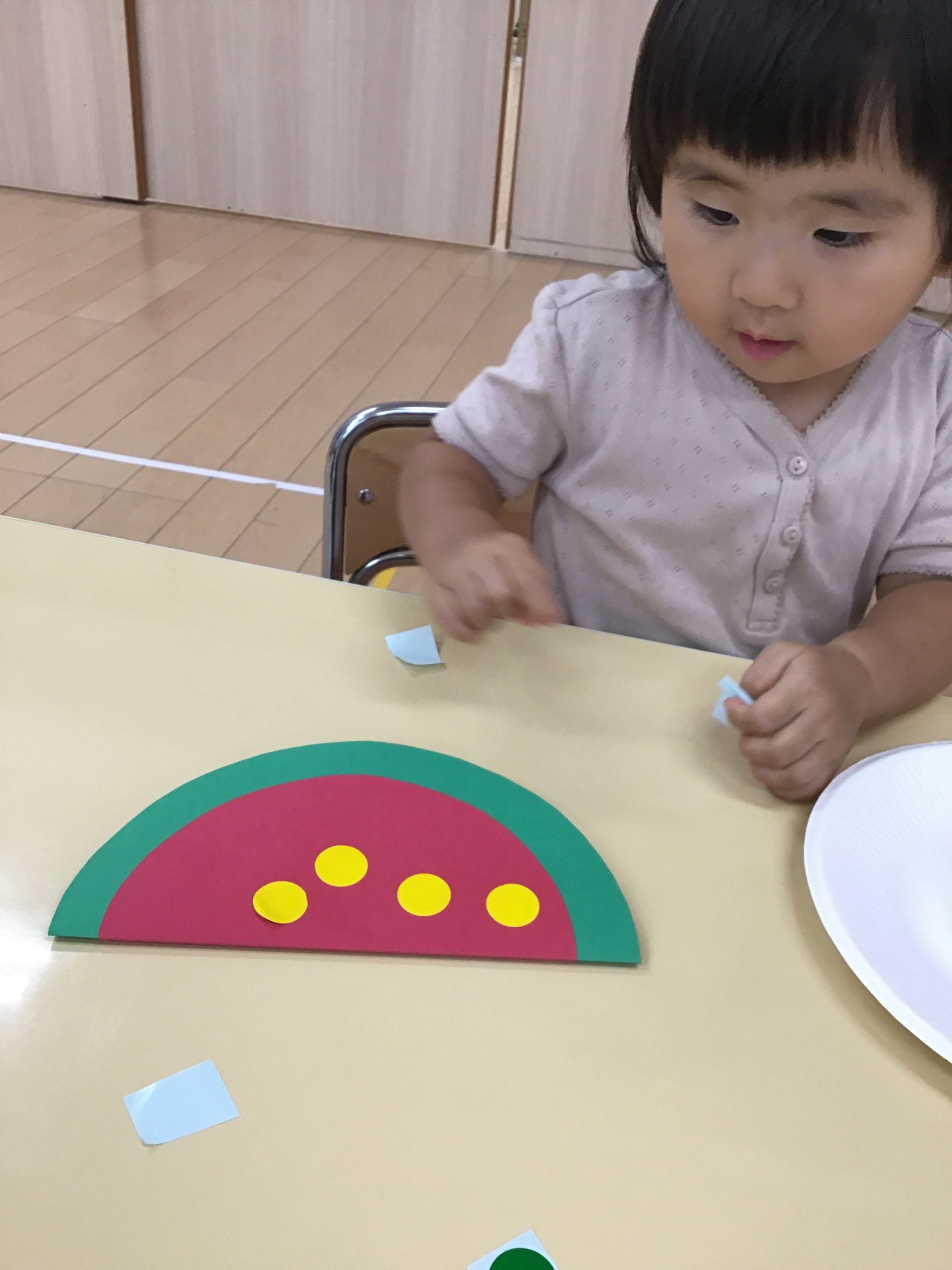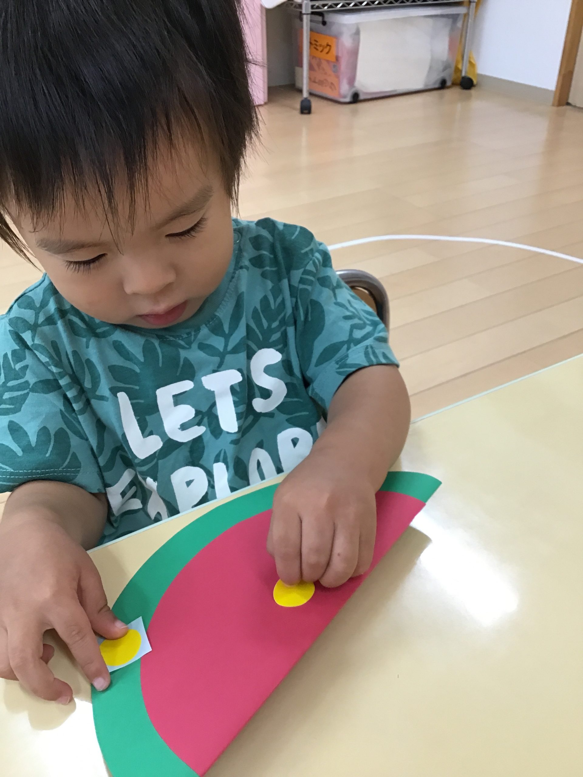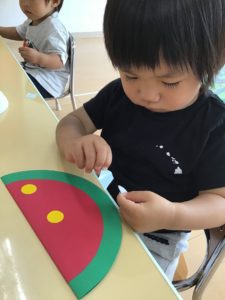 先日みんなで「すいか」を作りました。種の部分をシールで貼って