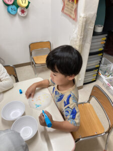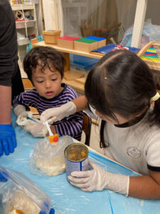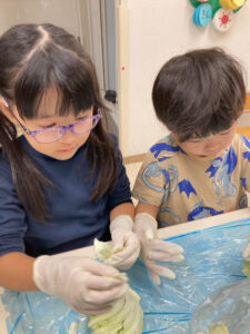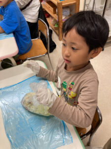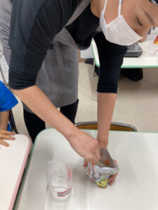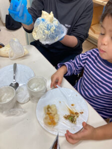 ビニール袋の中にホットケーキのもとを入れ、袋の上からこねたり、フルーツの缶詰を入れ混ぜ合わせます。