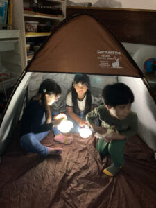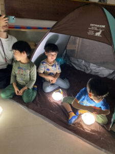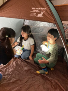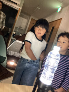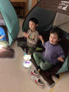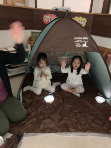 17日(金)の18:00~21:00まで3,4,5歳児の子達は「夜間保育」のイベントで災害時の夜を想定して避難訓練を交えたイベントを行ないました。当日は3名の保護者の方がボランティアできてくださいました。