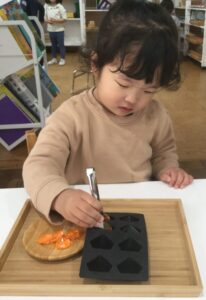 スプーンを使ってあけ移しをしています。スプーンの持ち方も上から握るのではなく、3本指を使うようなかたちで持つように伝えて行きましょう。スプーンの上に乗せたものをこぼさないよう、落とさないように別のところに移し替える作業も、大人は簡単そうに感じますが、けっこう難しいのです。平衡感覚が必要です。