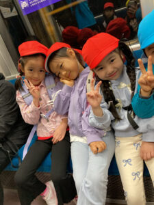 今回の遠足では、みんなで電車に乗ってお出かけしました。駅のホームでしっかりと列を作って並び、