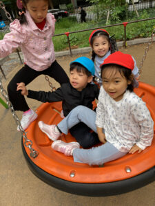 新宿中央公園の「ちびっこ広場」には、大型の複合遊具や、みんなで乗れるブランコなど、普段行く公園とは違った遊具がいっぱいでした。