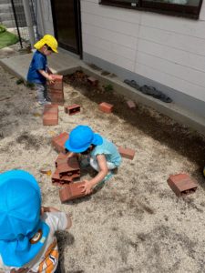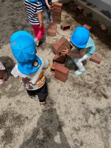 レンガのようなブロックで積み上げたり、形づくったりして遊んでいます。