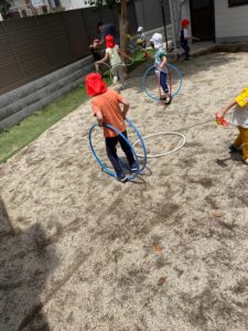 ボールをフラフープに投げ入れるゲームを考え出し、みんなで挑戦しています。子ども達が自らアイディアを出して遊びを考え、みんなで取り組む楽しさを味わっています。