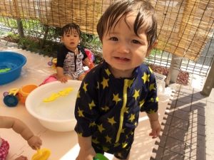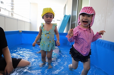 1歳児クラスのお友だちも水を自分で体に掛けてみたり、わにさん泳ぎをしてみたり、全身を使って水遊びを楽しんでいました。