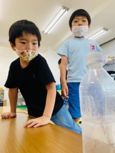 すると気圧の変化で白いもやの様な物がペットボトルの中にできます。それが雲と同じメカニズムで起きる現象です!!