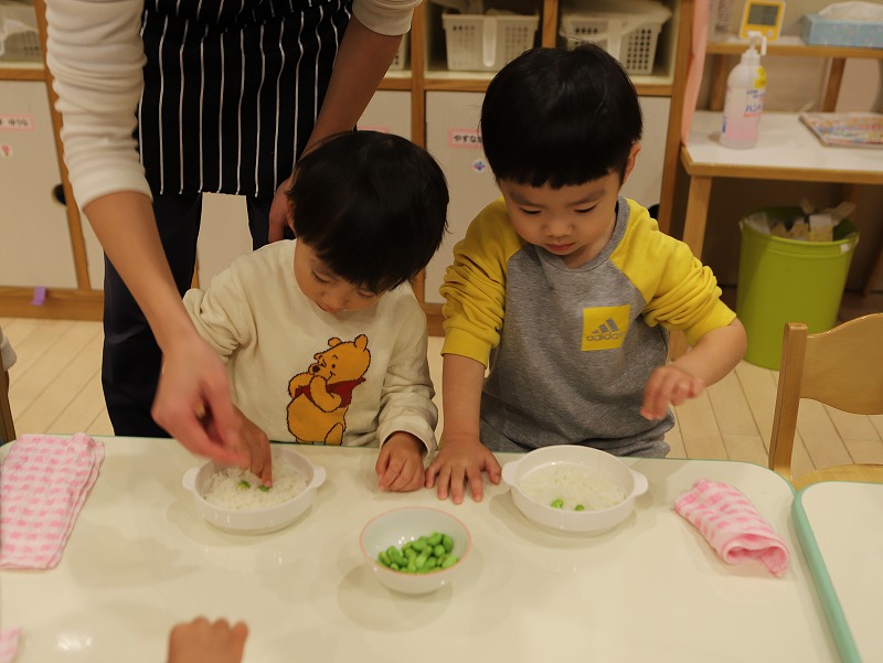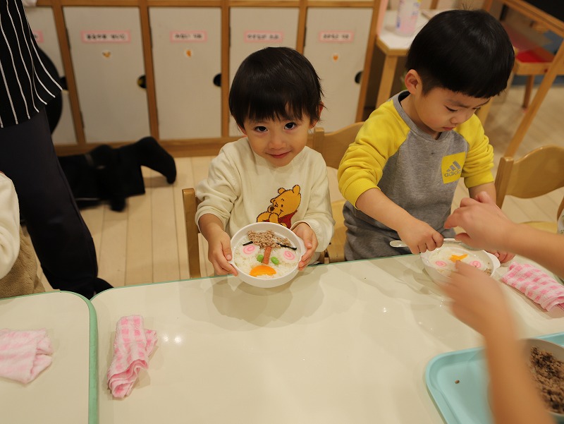 にじクラスのお友だちは目はここにして、口はここにして・・・と自分で考えながら作っていましたよ。出来上がると「先生見て~!」と可愛らしい福笑いごはんを見せてくれました。