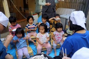 にじクラスのお友だちには、最後の仕上げとして塩を振ってもらいました。美味しくできますように…。