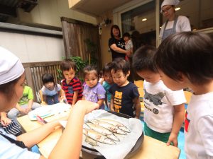 だんだん焼けてくると秋刀魚の良い匂いが漂ってきました。子どもたちも身を乗り出して秋刀魚に夢中な様子(^^♪