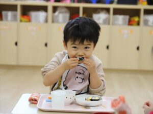 3歳以上のクラスでは手巻き寿司にして自分たちで恵方巻を作ったよ!上手にできたかな?
