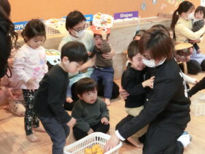近くのローソンさんに鬼になっていただき子どもたちの前に登場!!