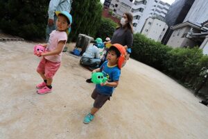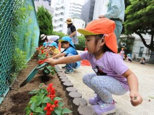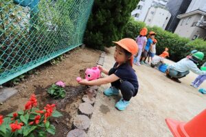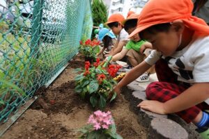 江戸川造園緑化協会の方から、毎年花壇づくりボランティアとして年に2回参加させていただいている花の植え替えが先日あり、今年度からは3歳以上児のクラスが参加させていただきました。