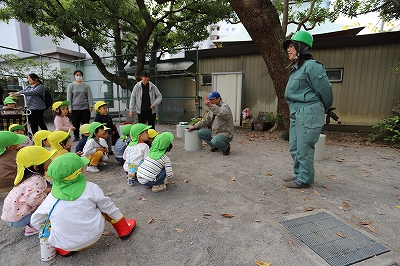 みんなスコップを手にするとやる気満々です。(*’▽’)土に穴を掘って花を一つずつ入れて、土のお布団をかけてあげます。先生や造園協会の方と一緒に行いました。