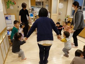 ”おおきなたいこ”の手遊び歌をアレンジしたものでは、クラスごとに大きな輪になってたいこの大小で小さくなったり、大きくなったりを表現してとっても盛り上がっていました。