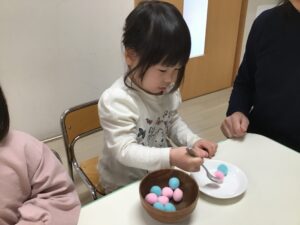 ふわふわボールを使って実際に器からすくって移し替えてみます。