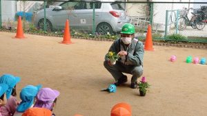今日は江戸川造園緑化協会の花壇づくりボランティアに参加してきました。毎年声をかけていただき行っている活動になりますが、今年度は2歳児以上のクラスが参加しました。(^^♪