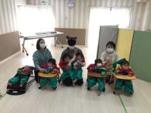 1歳児(Star)クラス:歌「あわてんぼうのサンタクロース」大きく体を揺らし、鈴を鳴らしていました♬♬ ダンス「はらぺこあおむし」なかなか振り付け通りにはいきませんが、楽しんでいました。みんながあおむしになって、蝶に変身!