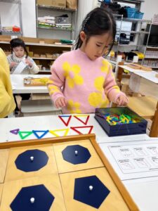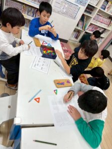 子どもたちは、ジオメトリックスティックやカラースティックを使ってさまざまな三角形を作り