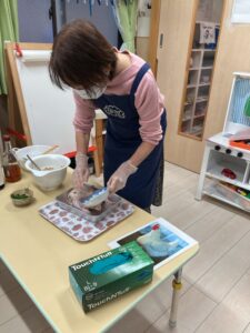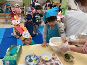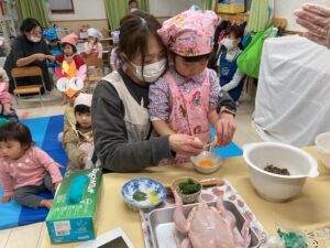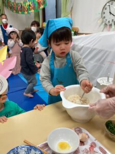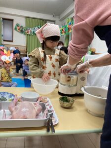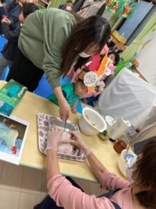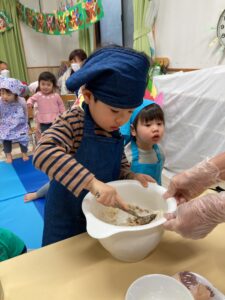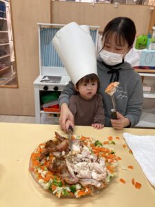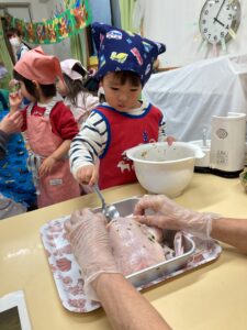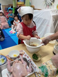 パン粉もスタッフィングに混ぜて、混ぜて! 隣で1歳児さんが興味津々で見つめています。