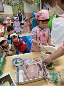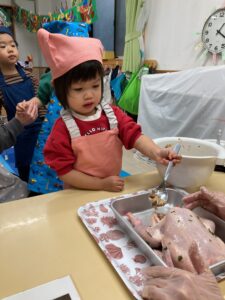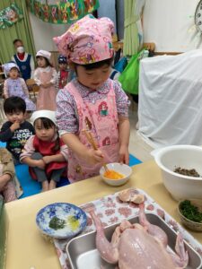 スタッフィングをスプーンで鶏のお腹に詰め込みます。恐々泣きそうになっているお子さんもいましたが、やってみたいという気持ちが上回り、次々に私も僕もやりたいと挑戦していました。